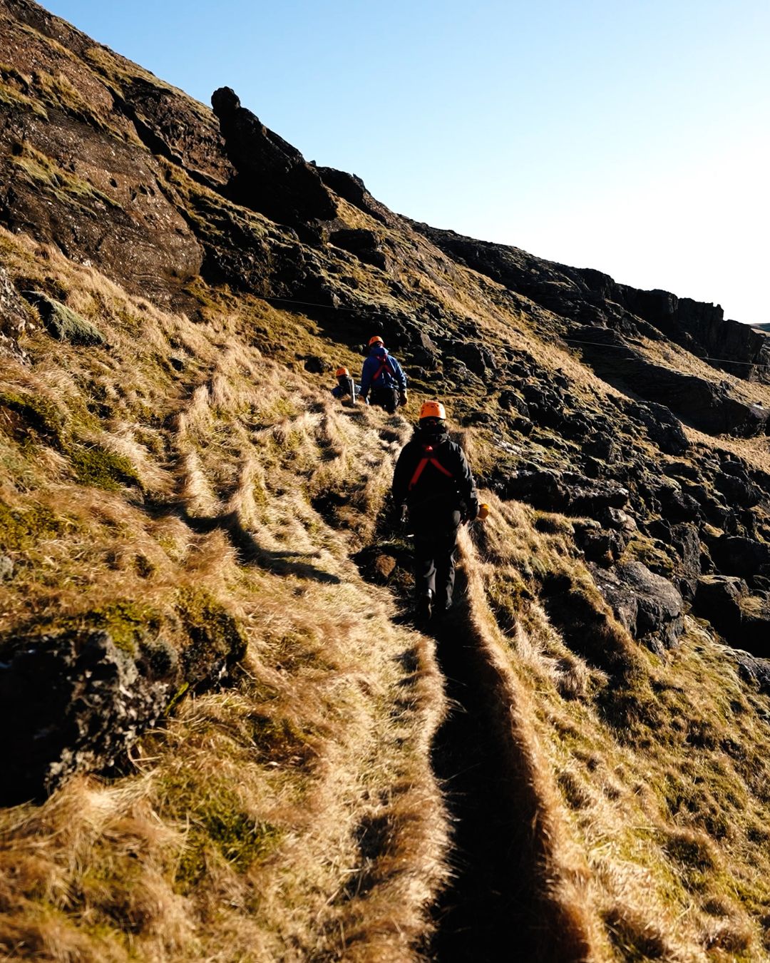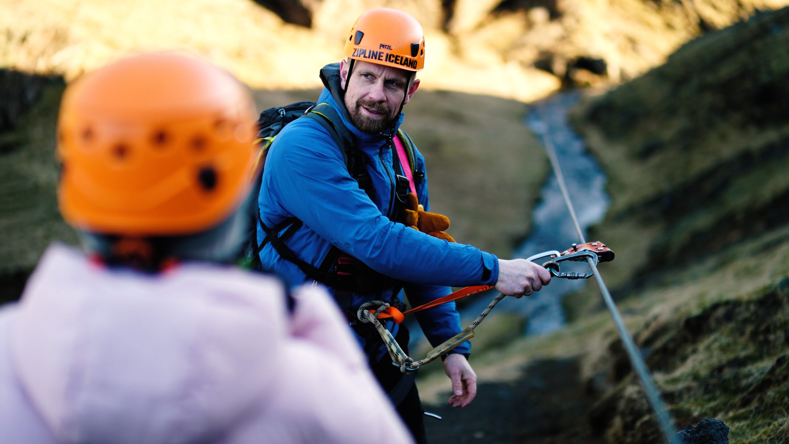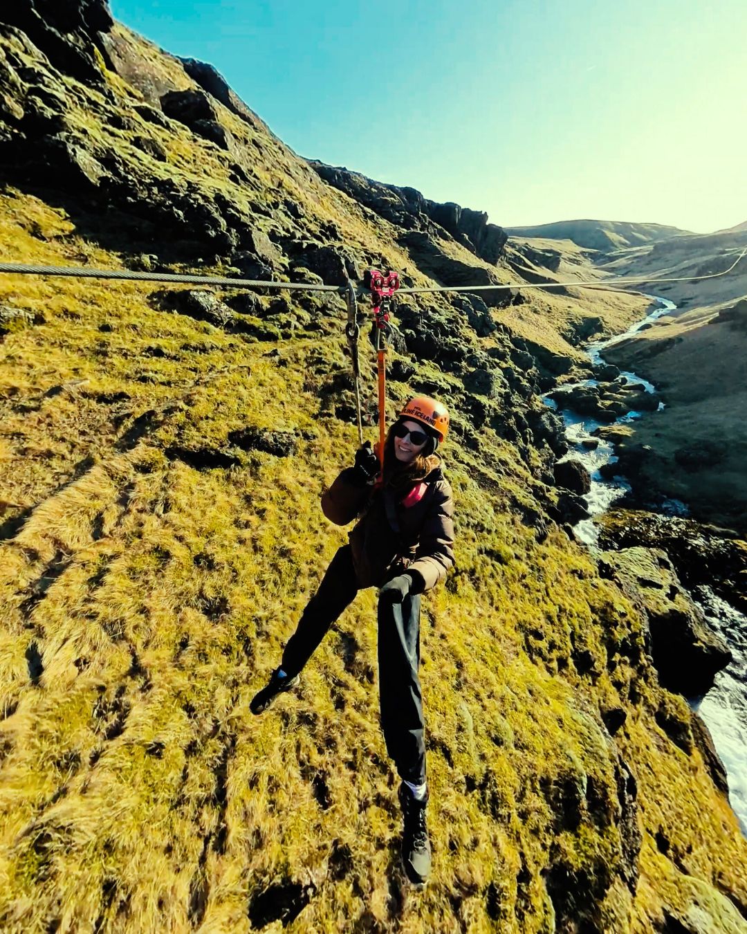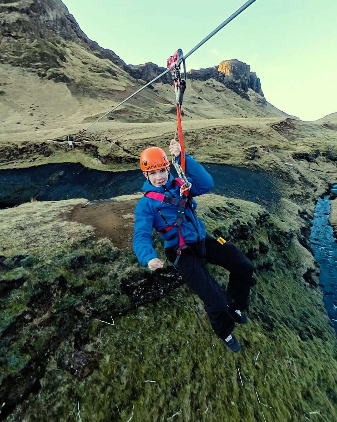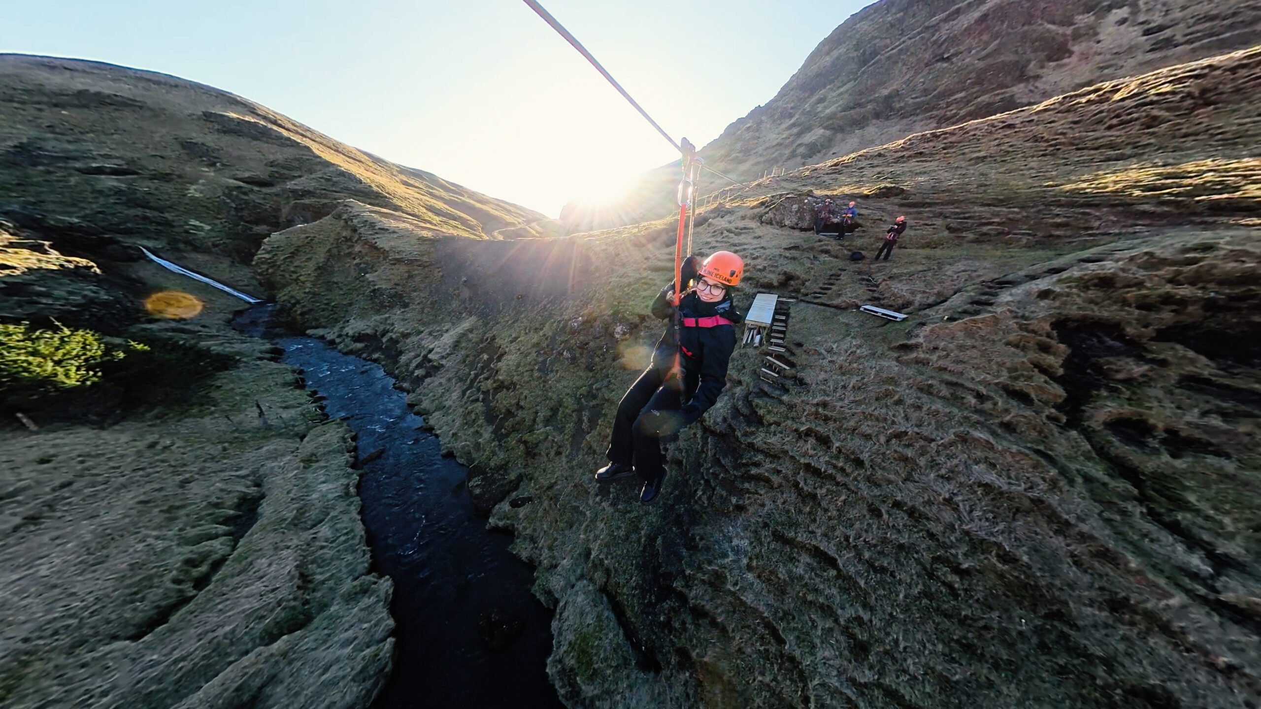 Our Ziplines are next to the village of Vík in South Iceland, surrounded by beautiful hills and valleys. It is not directly accessible by vehicle, so after we meet at our base at in Vík, we drive for 5 minutes, then hike for another 5 minutes at a moderate pace to reach the take-off platform for the first zip, named Little Rush. We will give you detailed safety instructions and ensure you are comfortable with what to do during the zipline so you will enjoy the ride to the fullest and stay safe. Once you’re ready, you wait your turn, and the next thing you know, you are zipping above the canyon, heart pumping with excitement and having the best birds-eye view of the area you couldn’t imagine beforehand.
